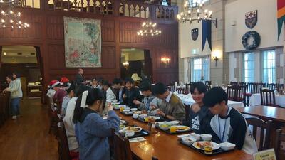 現地では、様々な授業をネイティブの講師が行うだけでなく、フリータイムや売店等すべての場面において英語での会話がなされ、24時間【英語漬け】の体験ができます。ちょうどクリスマス・シーズンということもあり、建物のあちこちに綺麗な飾りつけがされていました。雪ではなく、雨と霧景色のクリスマスになったようですが、生徒たちはブリティッシュヒルズでの非日常の生活を楽しむとともに、各レッスンやゲームに積極的に参加しています。