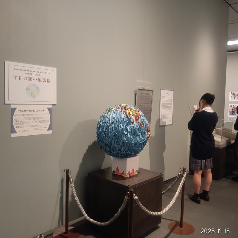 市内の小中学生の平和のポスターや、本校ユネスコ委員会を中心に全校生徒が作った「平和の鶴の地球儀」も展示されています。