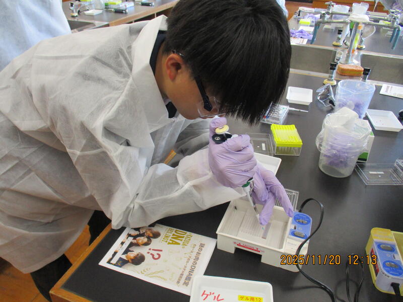 講座では、PCRで増幅したブタ・トリ・ウシのDNAを、電気泳動という方法で大きさごとに分け、どの動物のDNAなのかを判別する実験に取り組みました。
