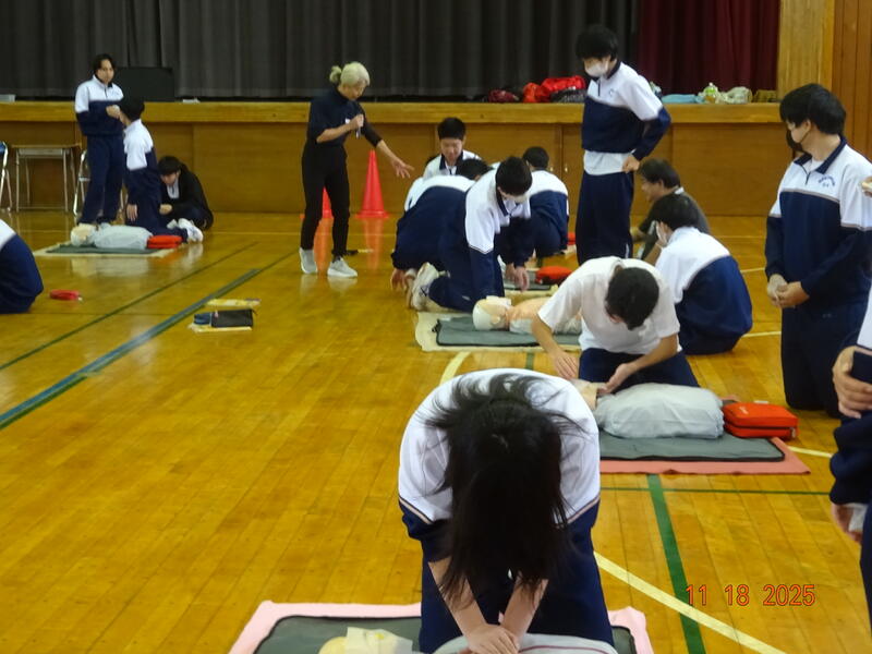 本日、日本赤十字社千葉県支部の救急法指導員の方を講師にお迎えして、沼高生1年を対象に「赤十字救急法基礎講習」を行いました。