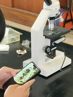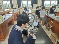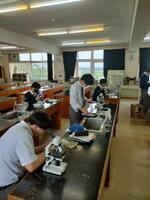 生物基礎の授業で、バナナの細胞を顕微鏡で観察しました。顕微鏡に映った細胞をiPadやスマホで写真に撮り、ロイロノートを使って、みんなで情報共有をします。バナナの細胞にヨウ素液をたらしてデンプン粒を確認し、今後は、細胞の特徴をスケッチしながら、さらに詳しく学びます。バナナの細胞をうまく観察できた生徒は、難易度の高い赤いパプリカの色素を観察し、同じく映像を写真に収めました。今後は、「酵素の反応観察」「DNAの模型作成」などの学習を予定しています。