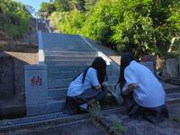 ボランティア同好会は新1年生が6名加入し、5月末現在で48名の会員が活動しています。5月29日(水)の放課後、率土神社の参道・見晴台・U字溝の清掃に20名が参加しました。この活動は月1回実施しています。今回は新1年生も初参加となりました。あわせて地域の一人暮らしの高齢者の見守り活動(毎週水・金曜実施)を行いました。