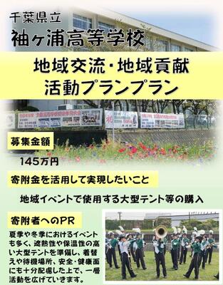 【目的】夏季や冬季におけるイベントが多いため、遮熱性又は保温性の高い大型テントを準備し、生徒の着替えや待機場所、安全・健康面にも十分配慮した上での活動拠点としたい。さらに、その活動の際に必要となる道具等を準備し、活動の一層の充実を図る。 【概要】特別活動(生徒会、学校行事等)や部・同好会活動が主体となって実施する地域交流・地域貢献活動を、袖ヶ浦高校では年間約50程度行っている。 その際、生徒が使用する大型テント等を購入する。 |