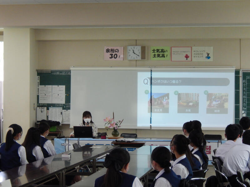 はじめに映像による韓国の紹介がありました。韓国の伝統的な挨拶の仕方や服装、また、韓国の高校生の実際の様子など、興味の尽きない内容でした。